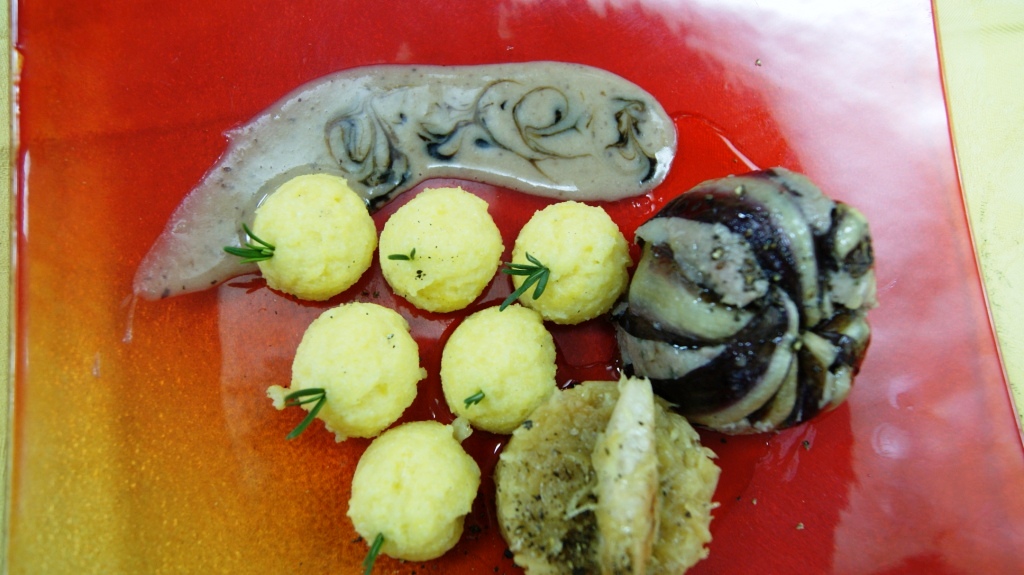 Radicchio farcito con carne , verza brasata e polenta farcita al formaggio Grana.