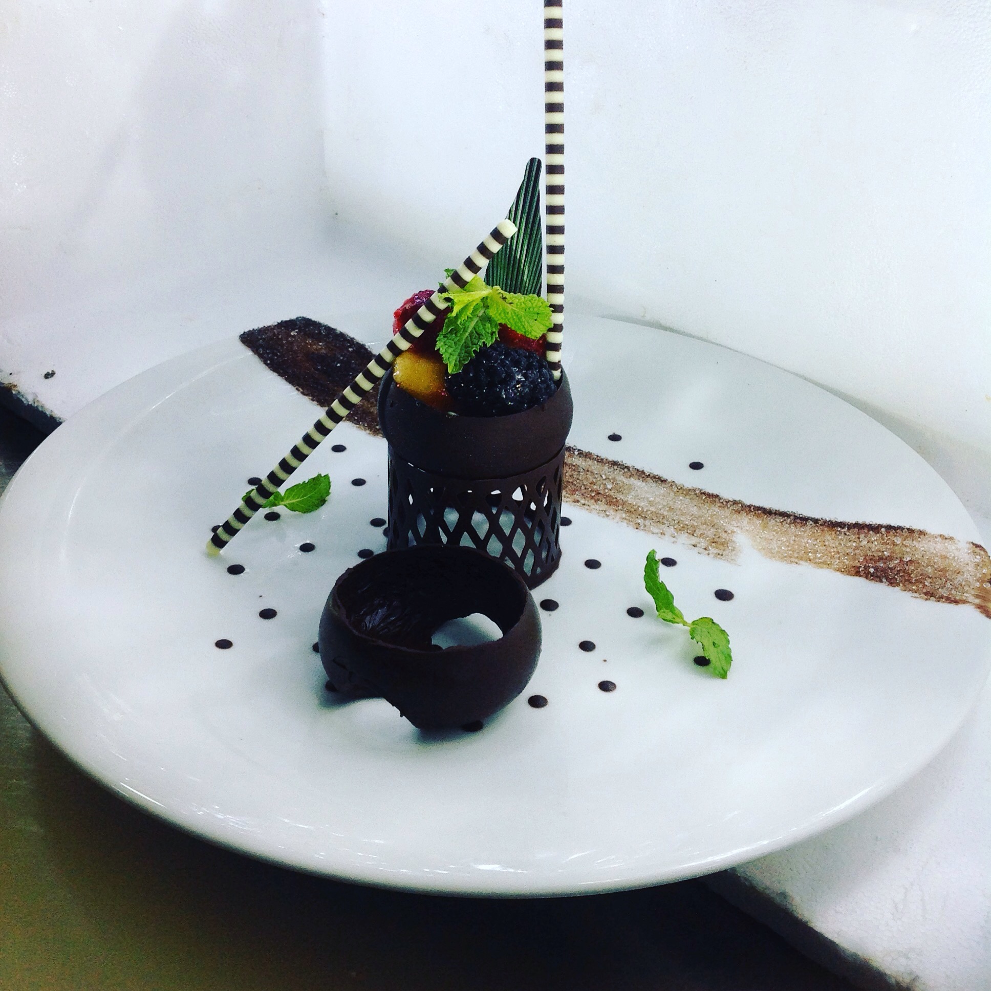The sparkling fruit in the chocolate basket presented this way, @chefexecutivemastergianmarialemura