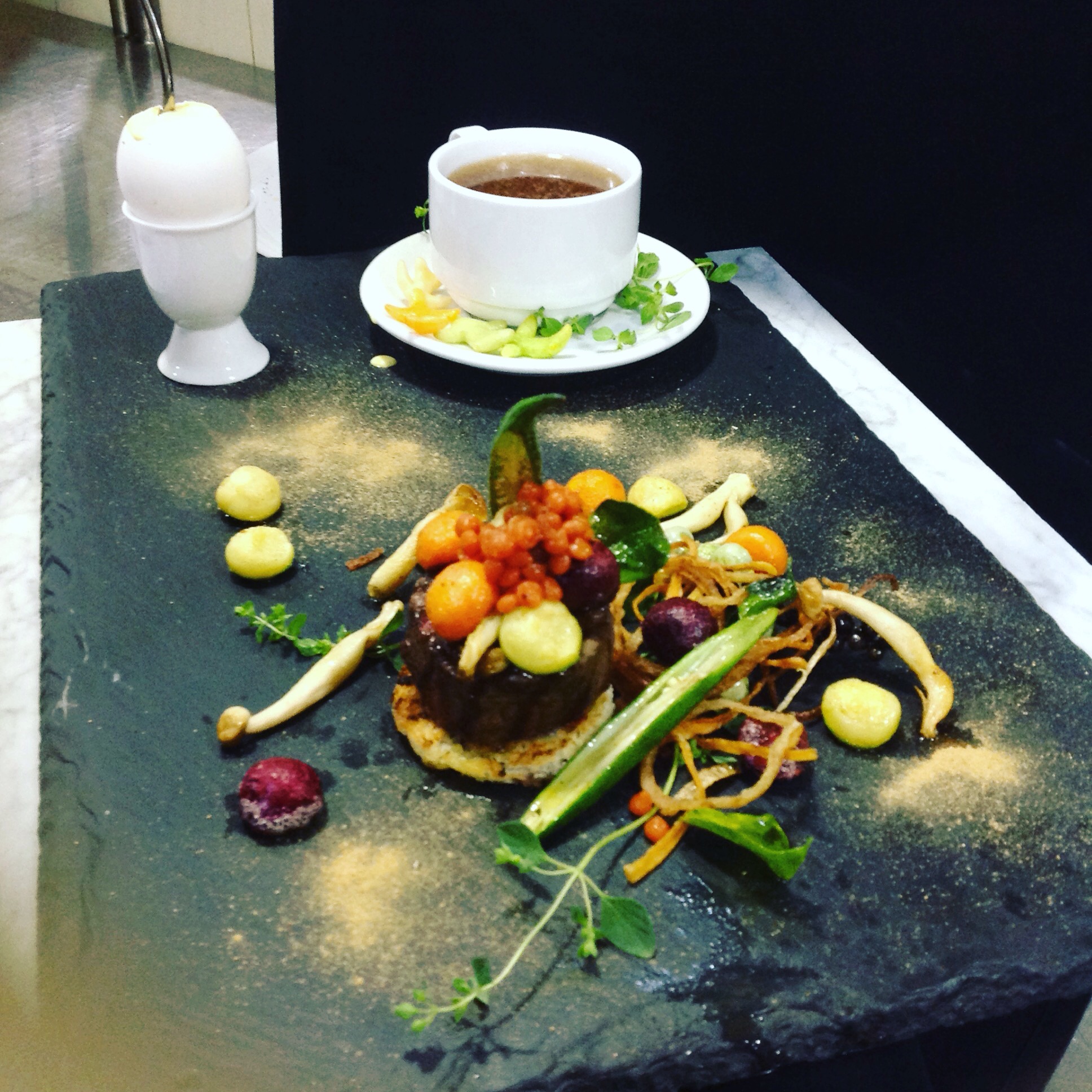 Grilled and boiled marinated beef fillet with vegetable storm and béarnaise sauce in egg, @chefexecutivemastergianmarialemura