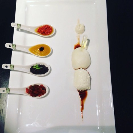 Homemade burrata with related seasoning ingredients – tomato spherified raparossa truffle and tomato cream,@chefexecutivemastergianmarialemura